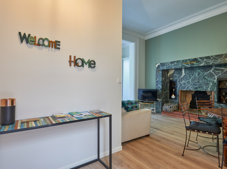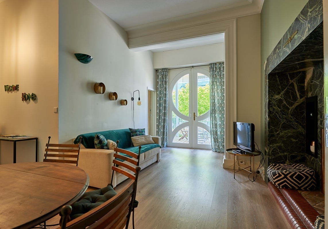 L’appartement offre une entrée avec placard, une pièce de vie avec une cheminée, une cuisine entièrement équipée, une chambre avec dressing ainsi qu’une salle d’eau avec WC