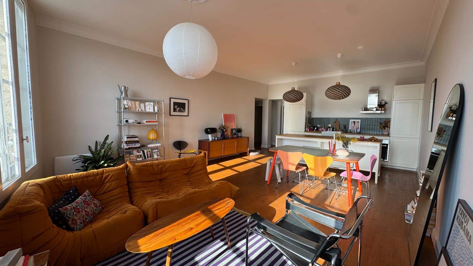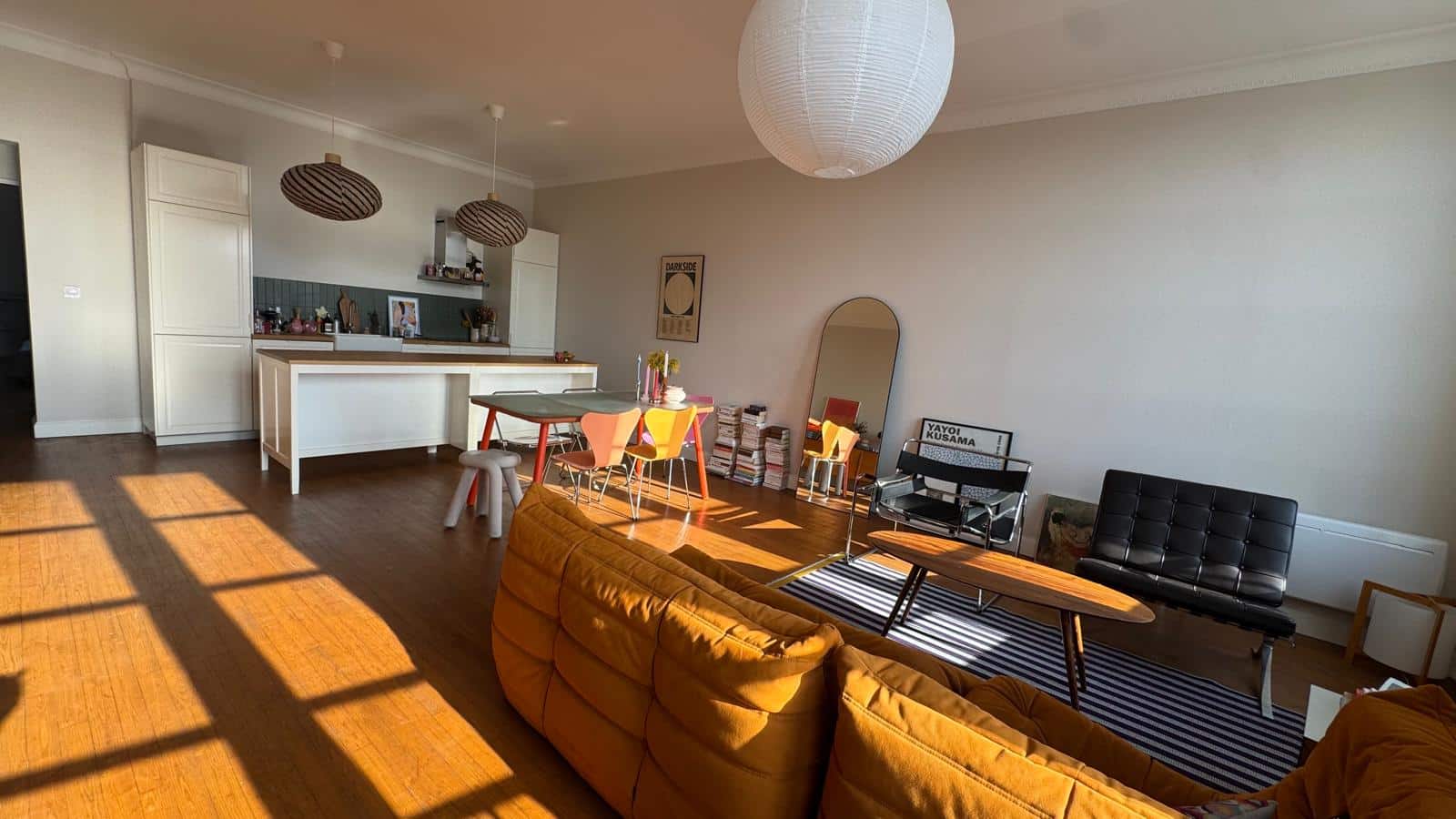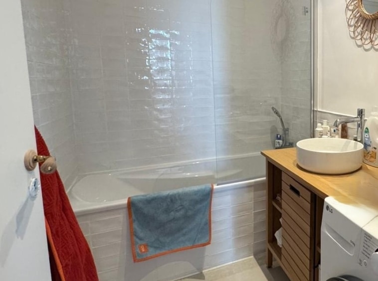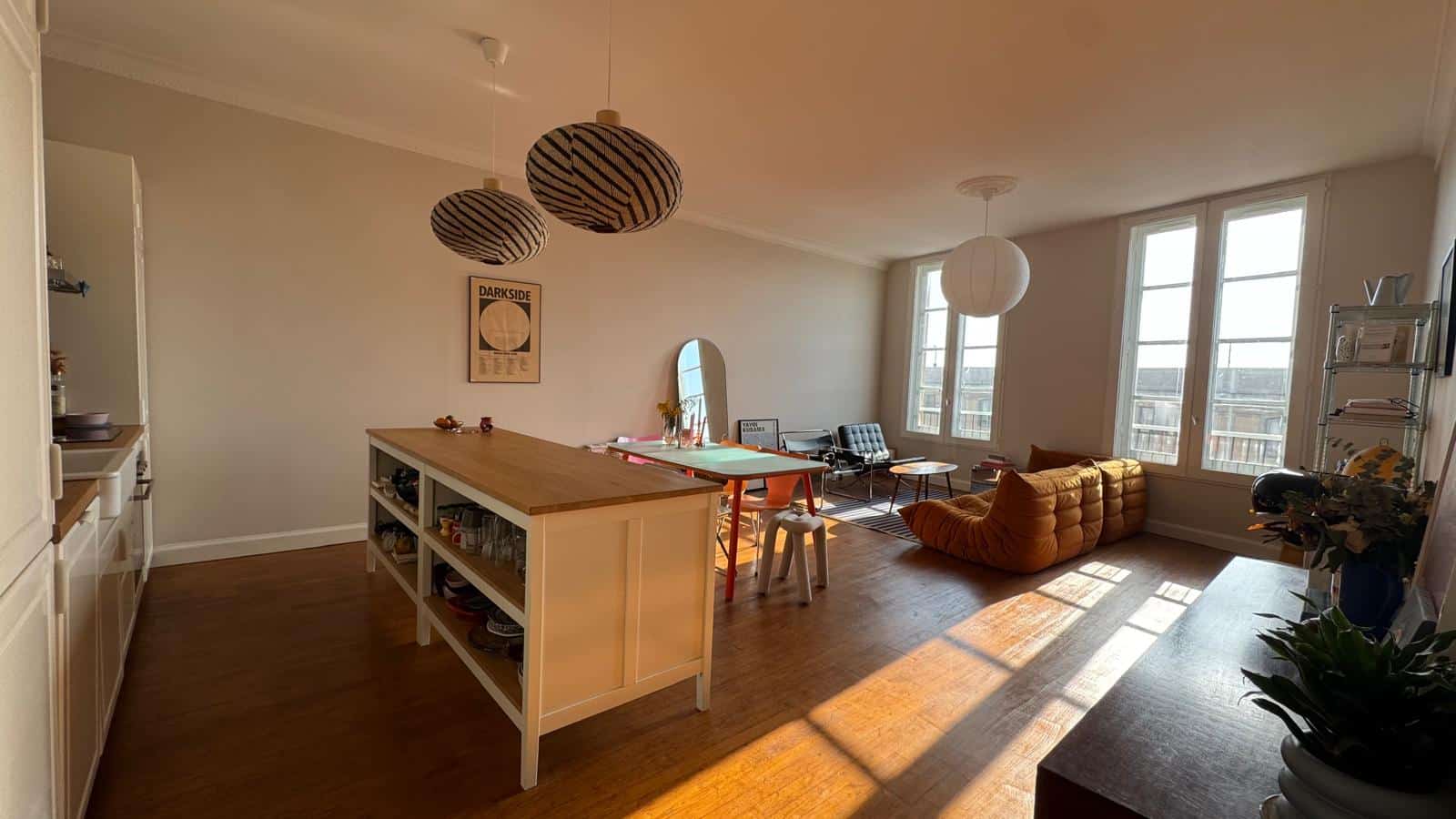 L’appartement s’ouvre sur une entrée menant à une pièce de vie baignée de lumière, avec cuisine ouverte entièrement équipée, offrant un cadre convivial et fonctionnel.