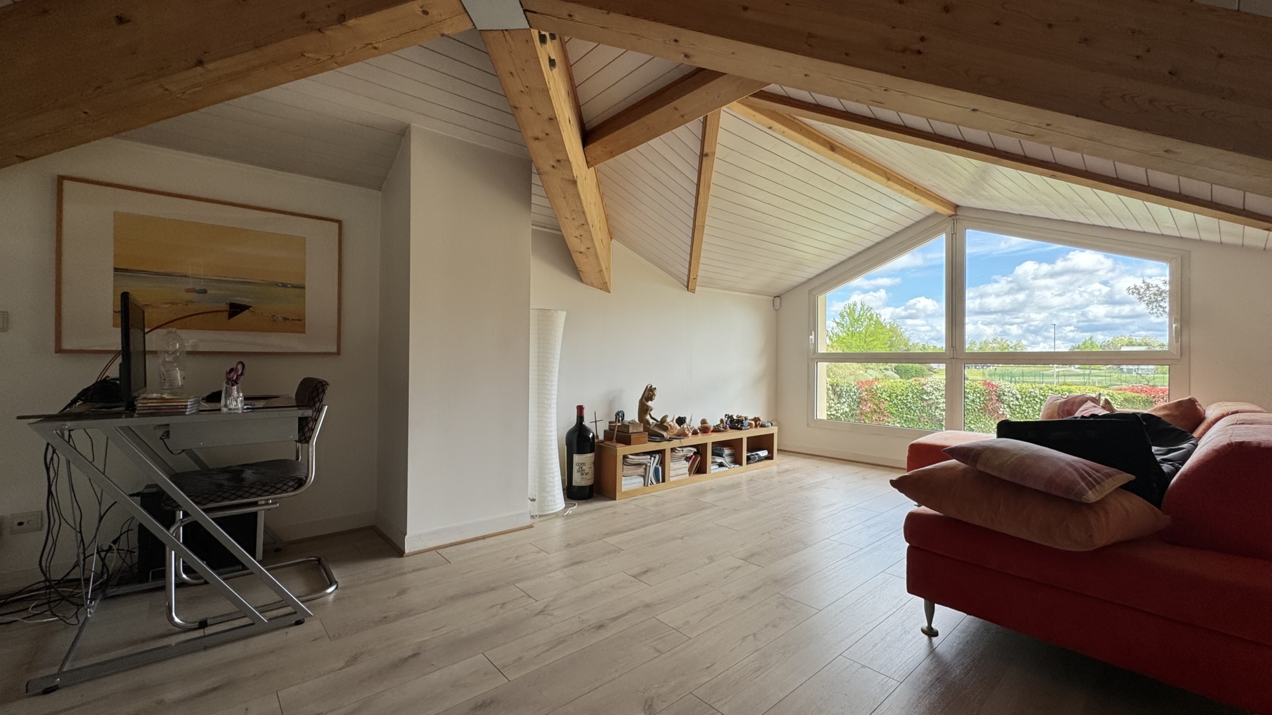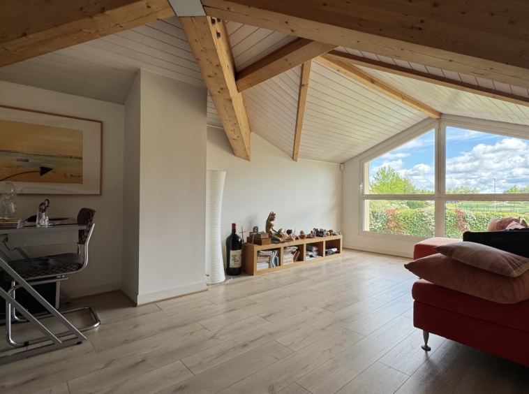 À l’étage, vous découvrez une grande mezzanine de 22 m2 actuellement ouverte sur le salon. Elle peut être facilement devenir une 4 -ème chambre ou un grand bureau. Elle offre une vue dégagée sur le Golf.