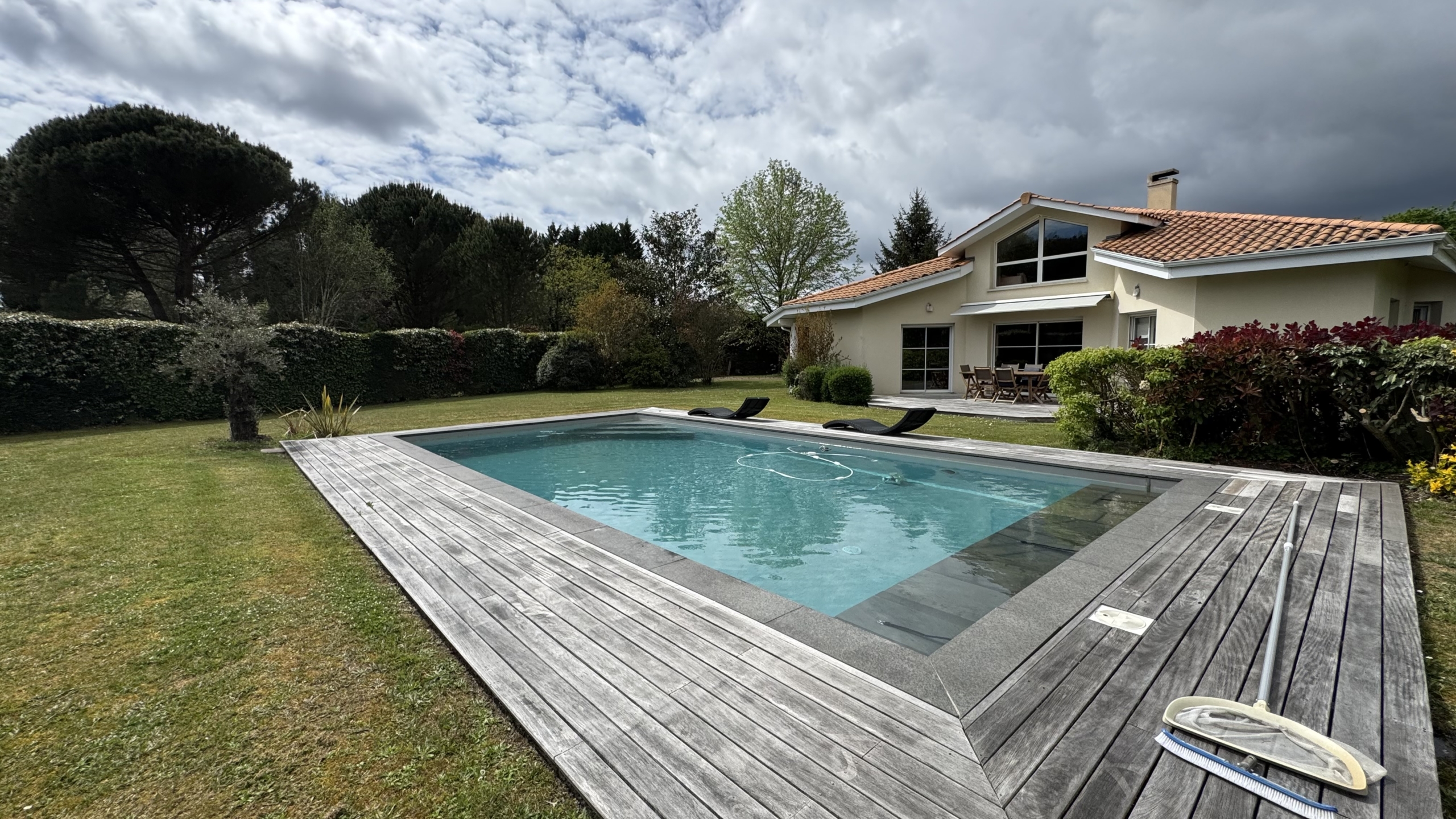 En extérieur, vous découvrez un vaste jardin de 1300m2 avec sa terrasse et sa piscine.