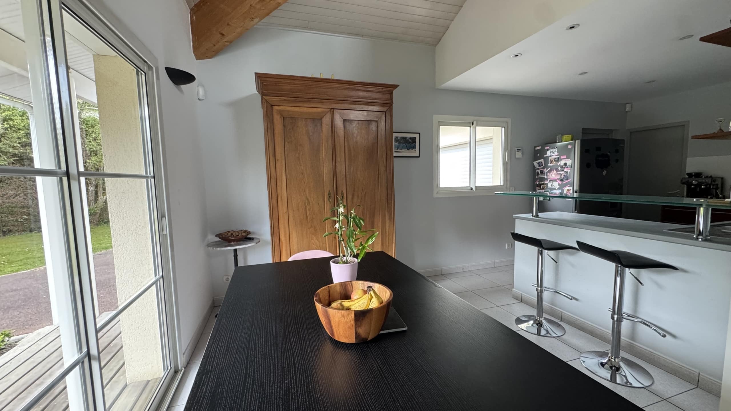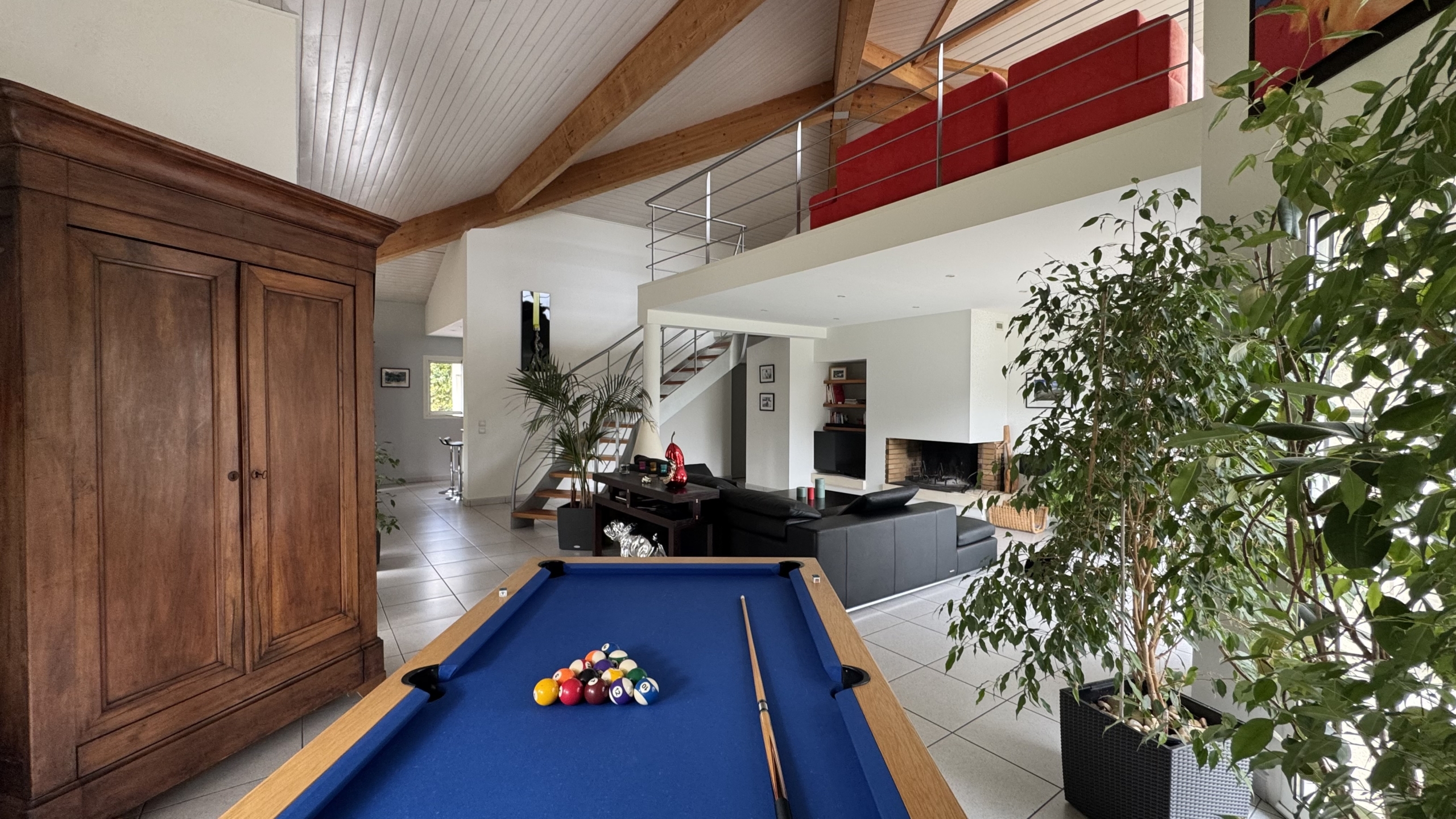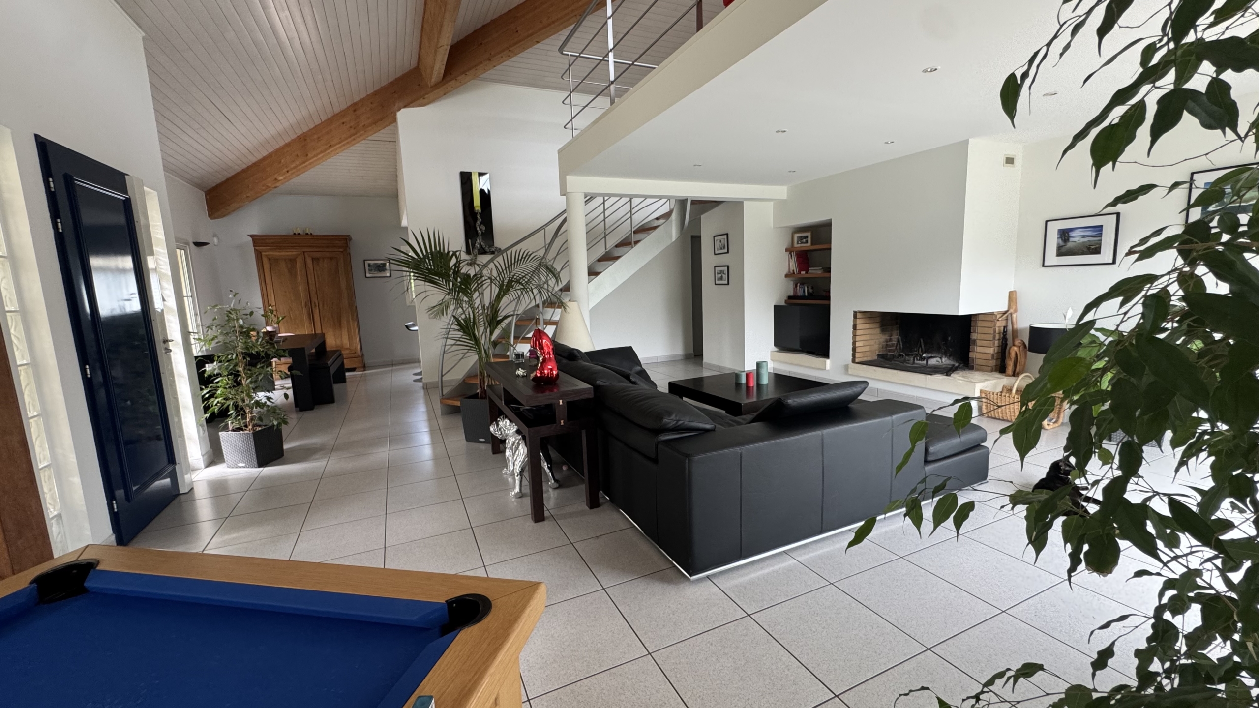 Au rez-de-chaussée, vous découvrez une vaste pièce de vie avec cheminée (64 m2) et une cuisine ouverte équipée avec arrière-cuisine.